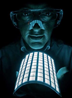 Anil Duggal poses with an organic light-emitting device at a General Electric Global Research laboratory