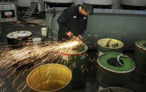 Jeff Bennett of Spokane County Biodiesel grinds off a spot weld on a locking ring atop a waste vegetable oil collection barrel Wednesday in Spokane Valley. The Spokesman-Review (DAN PELLE The Spokesman-Review )